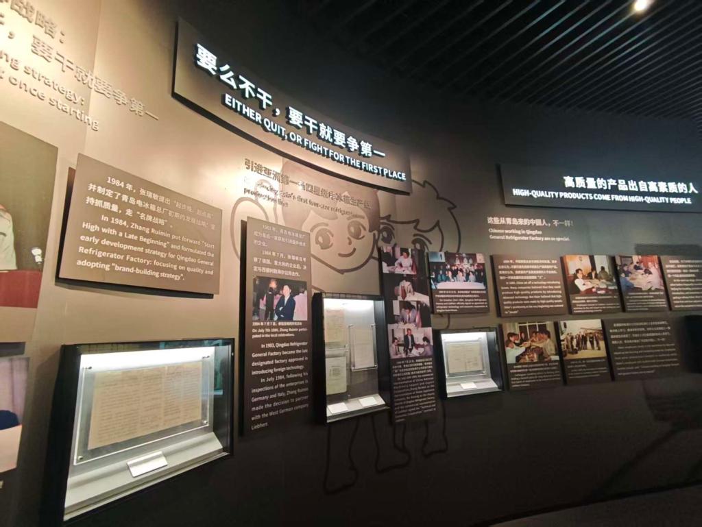海尔卡奥斯生态体验中心里的策划同样令人震撼。体验中心一层楼的生态展展示了海尔卡奥斯在智能工业化方面的深度介入,二层的文化展则讲述了海尔集团的创业历程、改革之路以及取得的成绩。