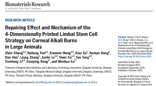 新闻网讯 近日,再生医学与检验创新研究院徐文华教授团队在国际知名期刊《Biomaterials Research》(中科院医学2区, IF=9.6)在线发表题为“Repairing Effect and Mechanism of the 4-Dimensionally Printed Limbal Stem Cell Strategy on Corneal Alkali Burns in Large Animals”的研究论文。商震为第一作者,徐文华教授和孔晓颖教授为共同通讯作者。